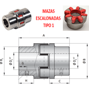 GR-42 COPLE ROTEX ( KTR ) DE FIERRO (GG) MAZAS ESCALONADAS (1) PILOTO CON SPIDER 98ShA PURPURA EXTERIOR 95mm LARGO 126mm