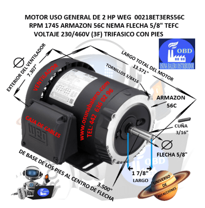 ENVIO GRATIS, ENVIO INMEDIATO DESPUES DE CONFIRMAR EL PAGO DEL PRODUCTO. MOTOR 2HP WEG NEMA 56C FLECHA 7/8 230/460V W22 No. 00218ET3E56C-S, EQUIVALENTE: MARATHON G585A 056T17F15640 SUST.G585 , DODGE BALDOR CEM3558, CM3558, MOTOR 2HP 4P 56C, Ver Ficha Técnica Aquí