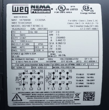 00218ET3ERS56C MOTOR 2HP WEG 1750RPM BRIDA 56C 230/460V W22