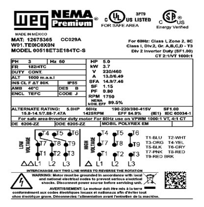 ENVIO GRATIS, ENVIO INMEDIATO DESPUES DE CONFIRMAR EL PAGO DEL PRODUCTO. MOTOR 5HP WEG NEMA 184TC FLECHA 1 1/8″ 230/460V W22 No. 00518ET3E184TC-W22,EQUIVALENTE: MARATHON GT1213 184TTFB6028, DODGE BALDOR CM3615T, CEM3615T, 5HP 4P 184TC, Ver Ficha Técnica Aquí