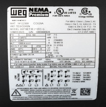 ENVIO GRATIS, ENVIO INMEDIATO DESPUES DE CONFIRMAR EL PAGO DEL PRODUCTO. MOTOR 7.5HP WEG NEMA 213TC FLECHA 1 3/8 230/460V W22 No. 00718ET3E213TC-W22, EQUIVALENTE: MARATHON GT1216 213TTFBA6028 , DODGE BALDOR CM3710T, CEM3710T, 7.5HP 4P 213TC, Ver Ficha Técnica Aquí