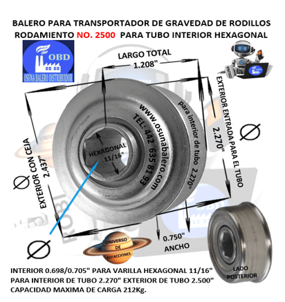COD. S17/QD6 ENVIO INMEDIATO, DIMENSIONES: RODAMIENTO PARA TUBO INTERIOR HEXAGONAL 11/16″ EXTERIOR 2.270″ ANCHO 1.123” EQUIVALENTE: FRANTZ 2500, CHINO 2500, TRANSPORTADOR DE TUBOS A GRAVEDAD, CONVEYOR TUB, OBD-13138, USAR CON TUBO DE EXTERIOR 2″