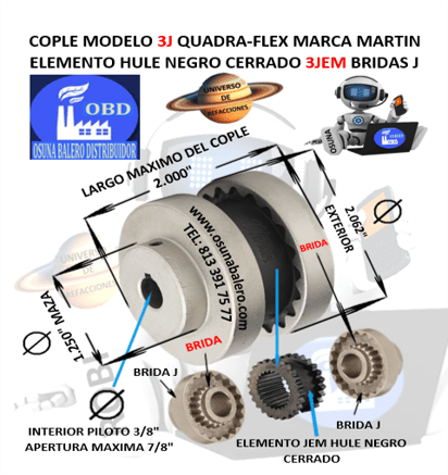 ENVIO INMEDIATO, DIMENSIONES: EXTERIOR= 2 1/16” LARGO= 2” DIAMETRO MAMELON DE BRIDA = 1 1/4” INCLUYE: 2 BRIDAS 3J Y ELEMENTO HULE NEOPRENO NEGRO 3JEM, EQUIVALENTE: TB WOOD´S 3JE CDS, 3-JE, Ver Ficha Técnica Aquí