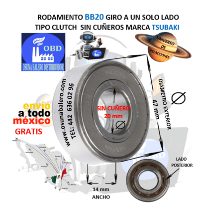 ENVIO GRATIS, ENVIO INMEDIATO DESPUES DE CONFIRMAR EL PAGO DEL PRODUCTO. DIMENSIONES: INTERIOR =20mm EXTERIOR =47mm ANCHO =14mm EQUIVALENTE: GMN FK-6204, MORSE KK-20, TSUBAKI BB-20, Formsprag USA CSK20, Marland CSK-20, Renold REUK20-2RS, Ringspann ZZ6204, Stieber CSK20-2RS, FREEWHEEL, Ver Ficha Técnica Aquí
