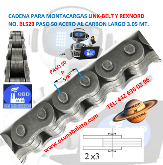 ENVIO INMEDIATO, CAJA 3.05 Mts ( 10FT. ) CADENA 50 2 X 3 ECONOMICA MONTACARGA EQUIVALENTE MORSE, TSUBAKI,REXNORD,TRANSLINK BL-523, ISO NO. LH 1023, Ver Ficha Técnica Aquí