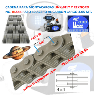 ENVIO INMEDIATO, CAJA 3.05 Mts ( 10FT. ) CADENA 50 4 X 4 LINK-BELT MONTACARGA EQUIVALENTE MORSE, TSUBAKI,REXNORD,TRANSLINK BL-544, ISO NO. LH 1044, Ver Ficha Técnica Aquí