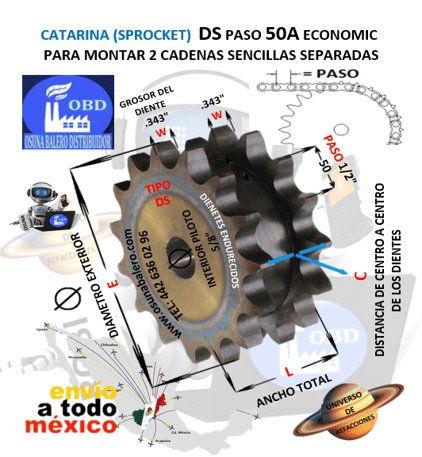 DS50A15 CATARINA PARA 2 CADENAS SENCILLAS SEPARADAS PASO 50 DE 15 DIENTES EXTERIOR E= 3.320″