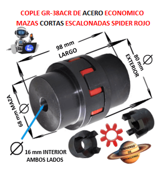 COD. S0/QF4 ENVIO INMEDIATO, DIMENSIONES: EXTERIOR =80mm LARGO =98mm EQUIVALENTE: ROTEX KTR 38 TIPO 1, LOVEJOY PARTE 68514462020 CJ38A-HUB-PM-5/8-NKW, HABIX HWN138F, ELEMENTO ROJO, 92 SHORE RED GR-38 Curved Jaw, ECONOMICO GR38-ACR