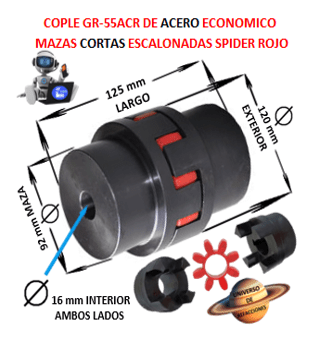 COD. S1/QF4, ENVIO INMEDIATO, DIMENSIONES: EXTERIOR =120mm LARGO =125mm EQUIVALENTE: ROTEX KTR 155 TIPO 1, LOVEJOY NO. PARTE 68514462416 CJ55A-HUB-CI-18MM-RSB, OPTIBELT HABIX HWN155F, ELEMENTO ROJO, 92 SHORE RED GR-55 Curved Jaw, ECONOMIC GR55-ACR, COPLES DE MEXICO, ECONÓMICOS
