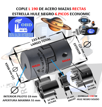 ENVIO GRATIS, ENVIO 24 A 48 HRS. DESPUES DE CONFIRMAR EL PAGO DEL PRODUCTO. DIMENSIONES: EXTERIOR =115mm LARGO =133.4mm MAZA 101.60mm EQUIVALENTE: MARTIN ML 190, MS 190, SRL 190, SRL190, LOVEJOY L-190, LOVEJOY NO.4 FIERRO ANTIMONIO, JAW190, JAW 190. Ver Ficha Técnica Aquí