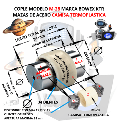 COD. S0/QE5 ENVIO GRATIS, ENVIO INMEDIATO DESPUES DE CONFIRMAR SU PAGO, DIMENSIONES: EXTERIOR 65mm LARGO 84mm COPLE BOWEX COMPLETO INCLUYE CAMISA TERMOPLASTICA ( SLEEVE ) M28 Y 2 MAZAS ( HUB M28 ), KTR M-28, Ver Ficha Técnica Aquí