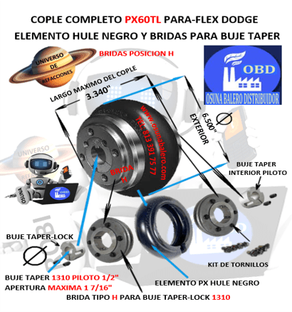 ENVIO GRATIS, ENVIO INMEDIATO DESPUES DE CONFIRMAR EL PAGO DEL PRODUCTO. DIMENSIONES: EXTERIOR 6.500” LARGO 3.340” EL COPLE COMPLETO INCLUYE 2 BRIDAS PARA BUJE TAPER LOCK N.P 010602 Y 2 BUES 1310 N.P. 119390 Y ELEMENTO TIPO LLANTA FLEXIBLE NP. 011106 EQUIVALENTES: MARTIN F60, HABIX, OPTIBELT D60, ABB DODGE PX-60 PARA FLEX, Ver Ficha Técnica Aquí