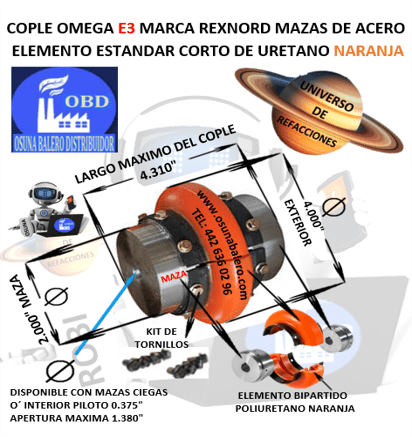 ENVIO GRATIS, ENVIO INMEDIATO DESPUES DE COMPROBAR EL PAGO DEL PRODUCTO. DIMENSIONES: EXTERIOR 4” LARGO 4 5/16” MAZA 2” ACOPLAMIENTO COMPLETO REXNORD OMEGA INCLUYE MAZAS NO. 3 SHRB Y E3 ELEMENTO ELASTOMERICO FLEXIBLE NARANJA CON KIT DE TORNILLOS, EQUIVALENTE TB WOODS WE3, MAZA WE3H, FALK E-3 COUPLINGS, Ver Ficha Técnica Aquí