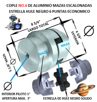 COD. S0/QE4 ENVIO GRATIS, ENVIO 24 A 48 HRS. DESPUES DE CONFIRMAR SU PAGO. DIMENSIONES: EXTERIOR = 6 3/8” LARGO = 8 3/4” MAZA = 5 1/8″ ACOPLAMIENTOS CON ELEMENTO FLEXIBLE DE HULE NEGRO MAZAS ESCALONADAS BARRENO PILOTO EQUIVALENTES: OBD GR-75A, LOVEJOY CJ75, COPLE PRESISA NO.6, INCLUYE ESTRELLA NO. 6 HULE NEOPRENO NEGRO, ACOPLAMIENTOS INDUSTRIALES, Ver Dimensiones Aquí