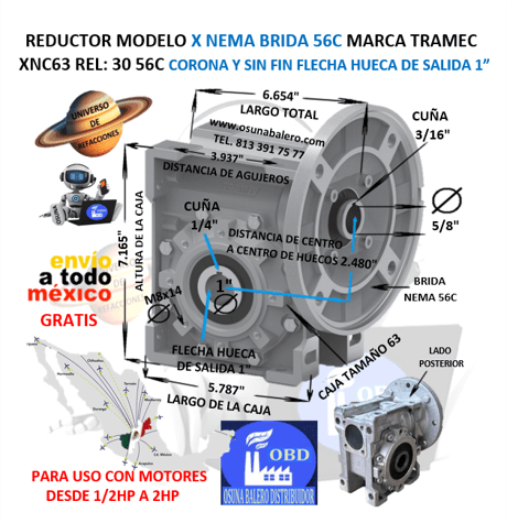 ENVIO GRATIS, ENVIO INMEDIATO DESPUES DE CONFIRMAR EL PAGO DEL PRODUCTO. XCN63 30 56C CAJA REDUCTORA TRAMEC 1.2HP 1750/58rpm FLECHA DE SALIDA HUECA DIAMETRO 1.00″ EQUIVALENTE: FALK MOTOVARIO NMRV 063, BONFIGLIOLI VF 063 GEAR BOX, Ver Ficha Técnica Aquí
