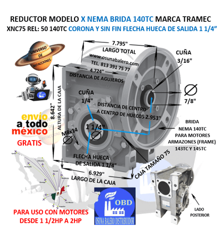 ENVIO GRATIS, ENVIO INMEDIATO DESPUES DE CONFIRMAR EL PAGO DEL PRODUCTO. XCN75 50 140TC CAJA REDUCTORA TRAMEC 1.5HP 1750/35rpm FLECHA DE SALIDA HUECA DIAMETRO 1.250″ EQUIVALENTE: FALK MOTOVARIO NMRV 075, BONFIGLIOLI VF 075GEAR BOX, REDUCTORES DE QUERETARO, Ver Ficha Técnica Aquí